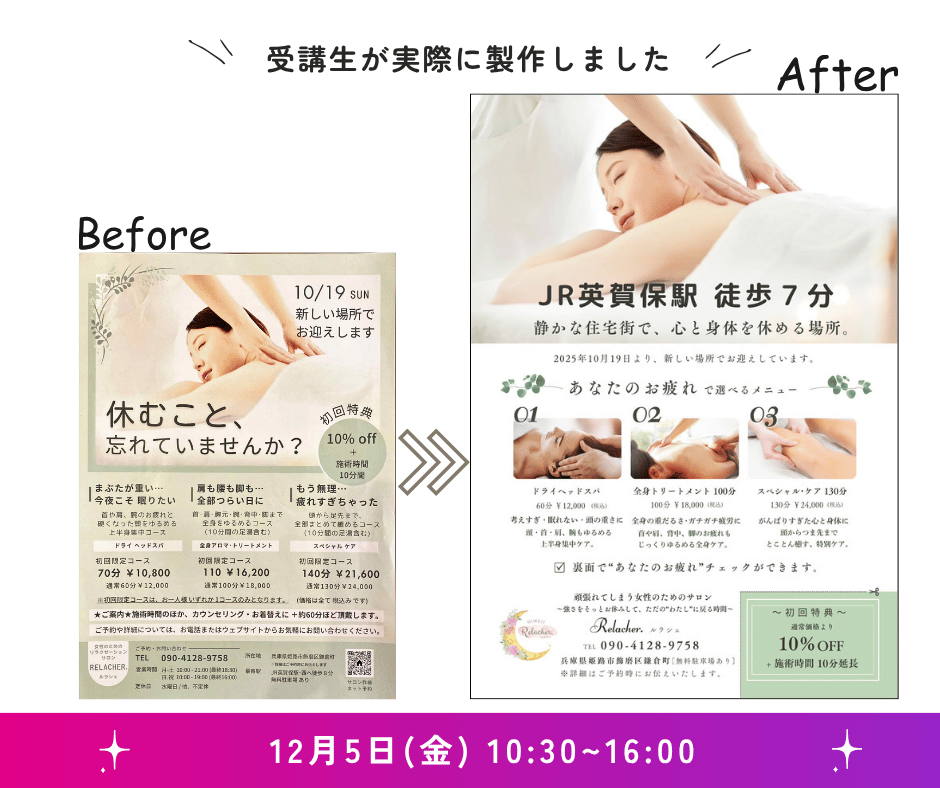 ※下記は実際に生徒さんの製作チラシです。独学で作ってきたチラシを、まるでプロが作成しように見やすさと目を惹く内容を兼ね備えたチラシに変身させています。